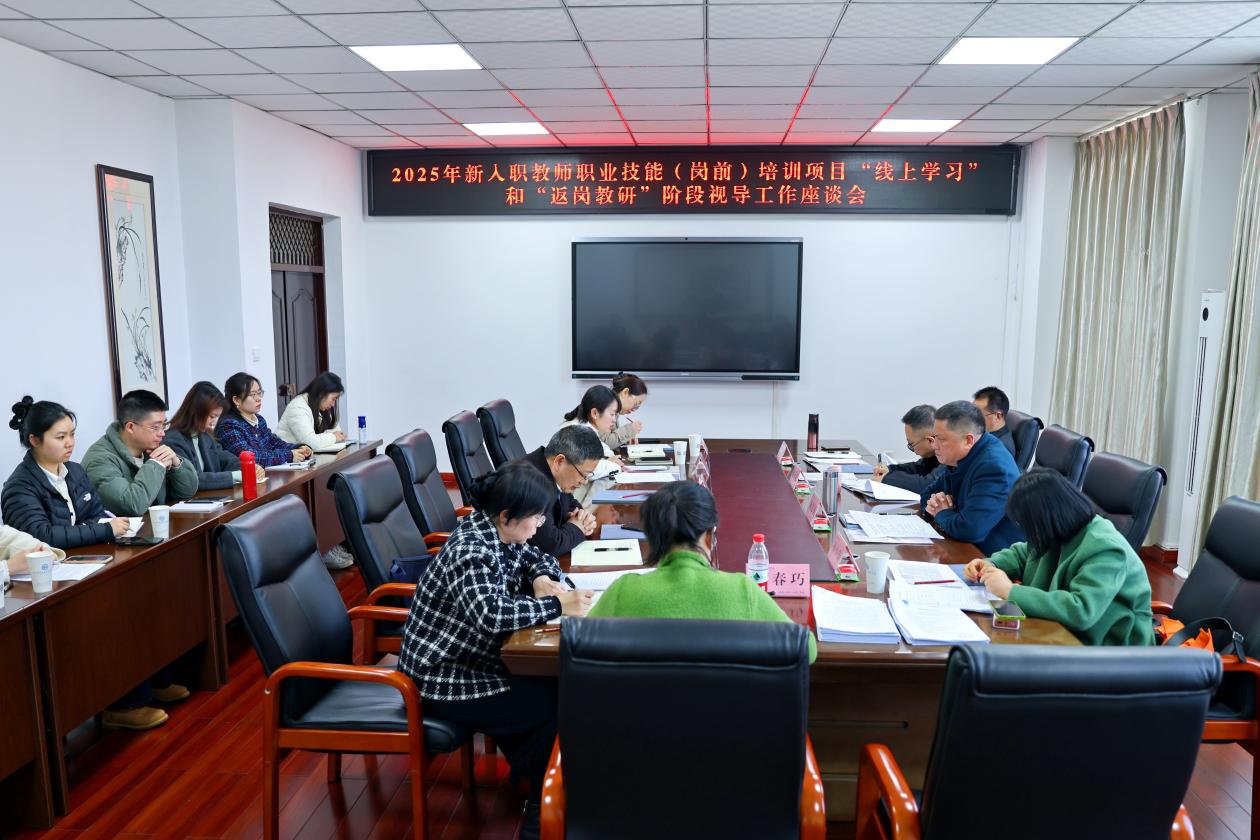林芝对视导工作组一行表示热烈欢迎,汇报了我校2025年新入职教师在“线上学习”和“返岗教研”阶段的整体工作情况,重点介绍了学校在教师培训组织、教学能力提升及返岗实践指导等方面的举措与成效。